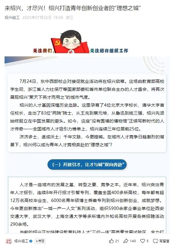 Shaoxing Organization Department |”Come to Shaoxing, Thrive in Shaoxing!” Building an Ideal City for Young Entrepreneurs
