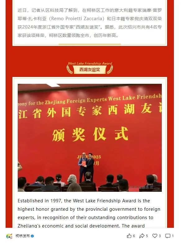 Keqiao Publish | 2 Foreign Experts Win West Lake Friendship Award