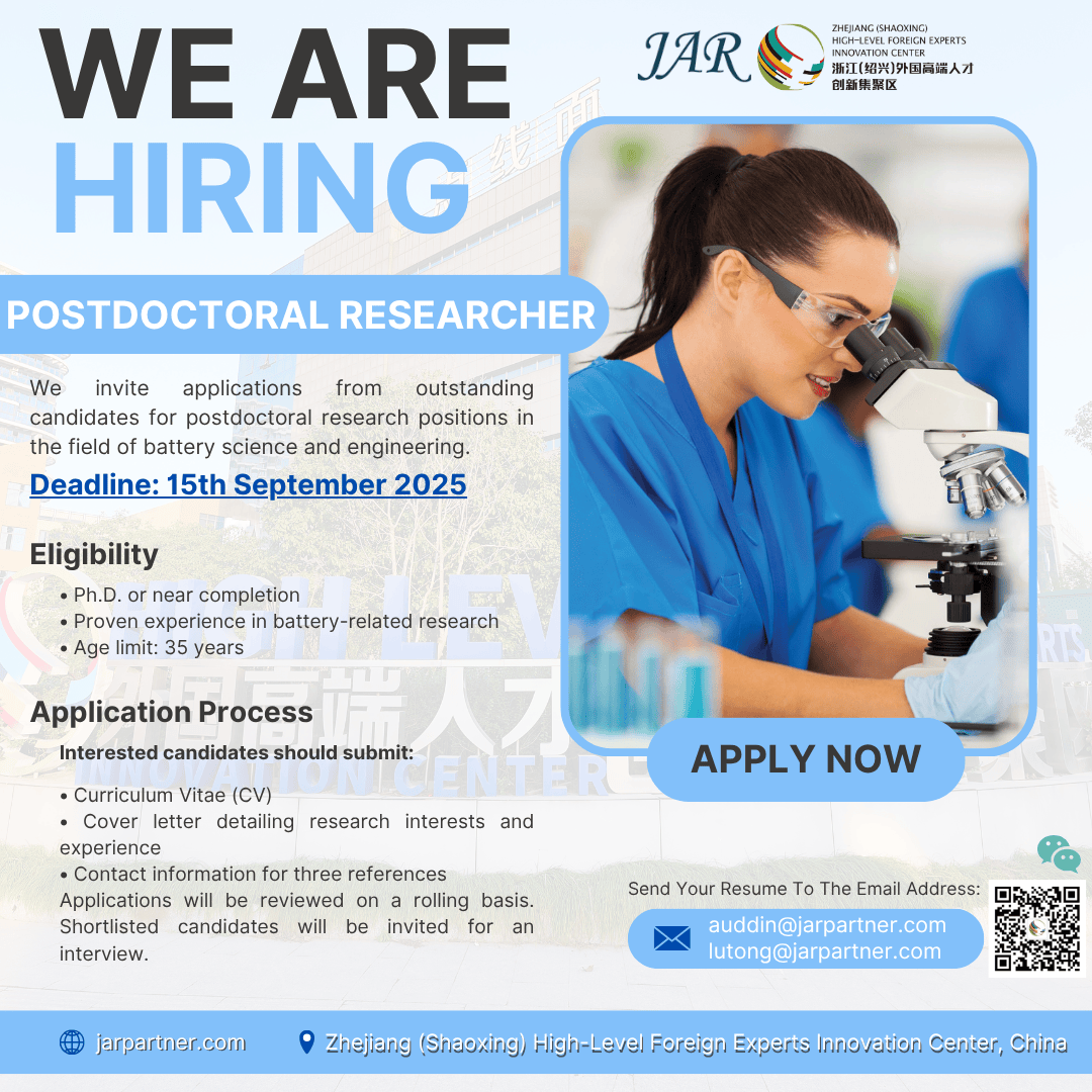 Keqiao International Park is now inviting applications from outstanding candidates for postdoctoral research positions in the field of battery science and engineering.