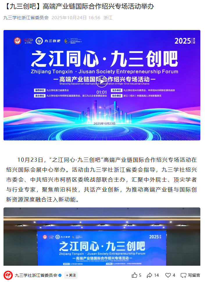 The “Jiusan Maker Space” High-end Industrial Chain International Cooperation Shaoxing Session was successfully held