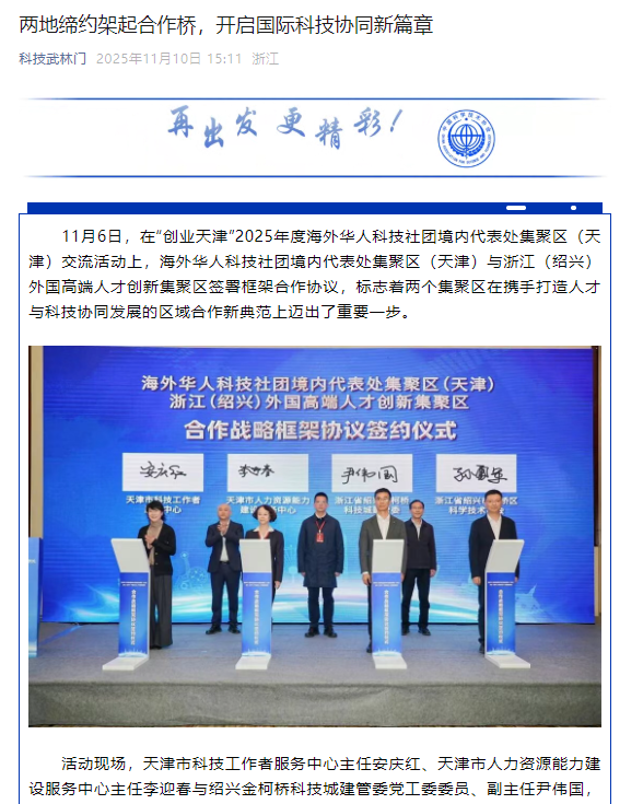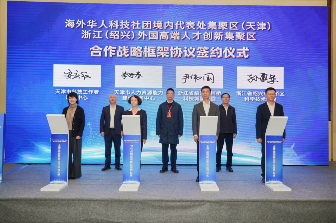 On November 6, the domestic office of the Overseas Chinese Science and Technology Association in the park (Tianjin) signed a framework cooperation agreement with the Zhejiang (Shaoxing) High-Level Foreign Experts Innovation Center (KIP) .