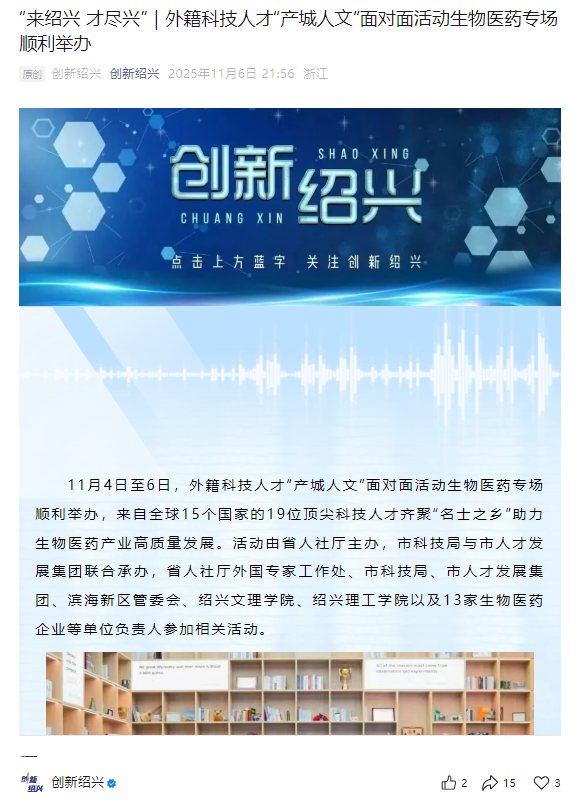 Innovation Shaoxing | The “Industry-City-Humanities” face-to-face event for foreign science and technology talents, biomedicine session, was successfully held.