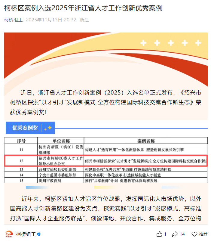 Keqiao Organization Work | A Keqiao District case was selected as an excellent innovation case in talent work for Zhejiang Province in 2025.