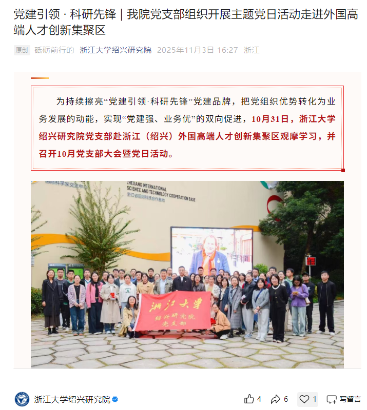 Zhejiang University Shaoxing Research Institute | Our Party Branch organized a themed Party Day activity visiting the Foreign High-End Talent Innovation Park.
