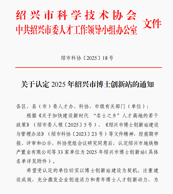 Good News | Shaoxing Zhuhai Overseas Foreign Talent Park Development Co., Ltd. was awarded the 2025 Shaoxing Municipal Doctoral Innovation Station.