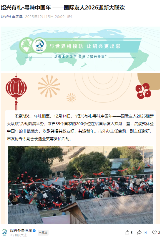 Shaoxing Foreign Affairs Hong Kong and Macau| Courtesy of Shaoxing · Tasting the Chinese New Year — 2026 New Year Gala for International Friends